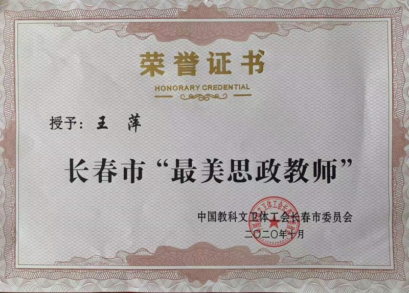 为深入贯彻落实习近平总书记在全国高校思想政治工作会议和学校思想政治理论课教师座谈会上的重要讲话精神,宣传党的十九大以来全市优秀思政教师先进事迹,2020年长春市教科文卫体工会开展了“最美思政教师”评选活动。经我校推荐申报,主办单位考核后,我校思政部王萍老师荣获长春市“最美思政教师”称号。在此荣誉的激励下,思政部广大教师将继续认真履行立德树人的崇高使命,给学生心灵埋下真善美的种子,引导学生扣好人生第一粒扣子,打造一支可信、可敬、可靠、乐为、敢为、有为的思政教师队伍。