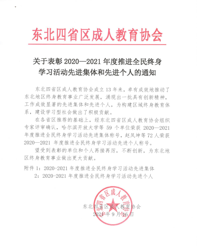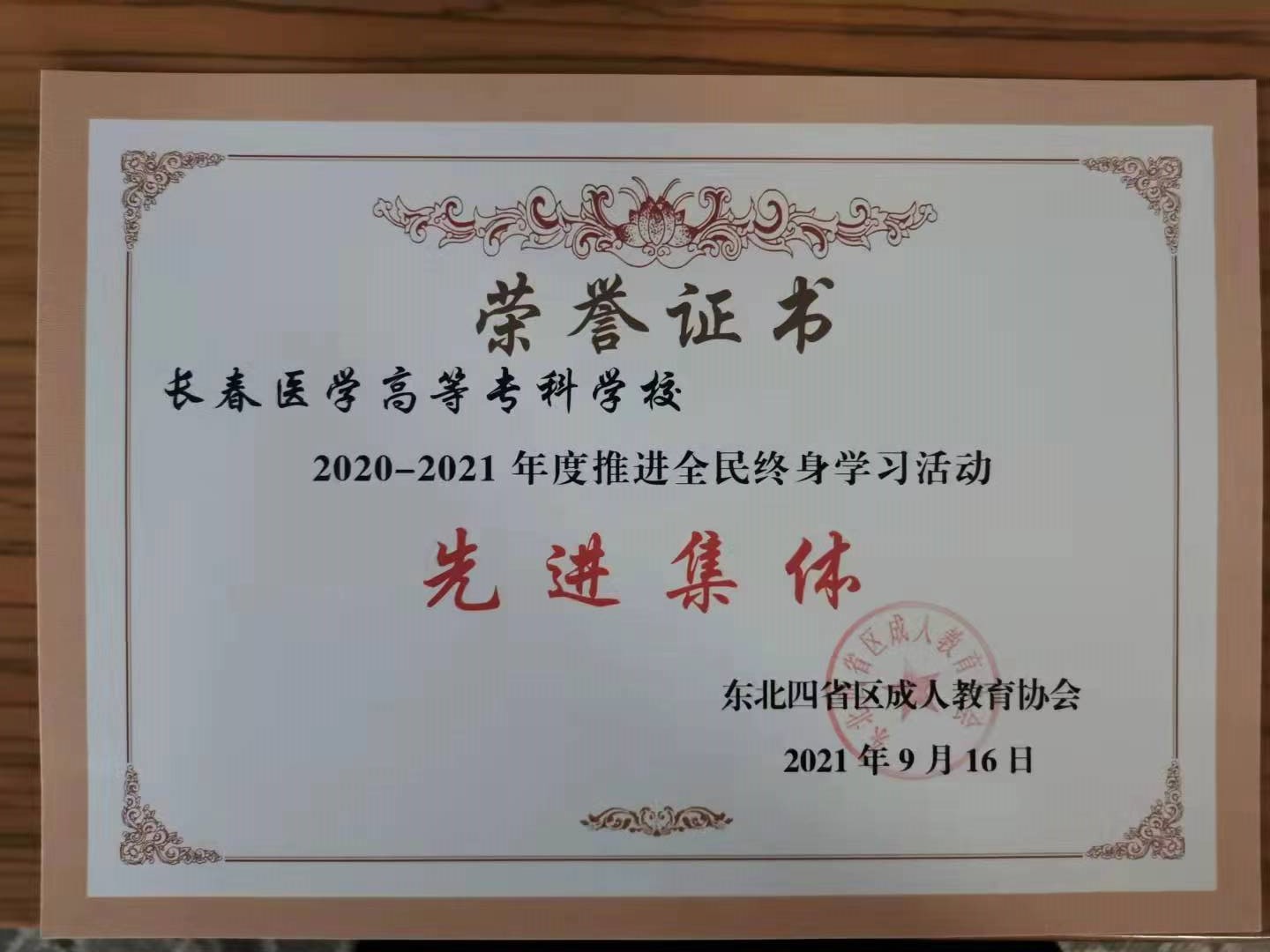在东北四省区成人教育协会主办的全民终身学习评选活动中,我校荣获2020-2021年度推进吉林省全民终身学习活动先进集体称号。