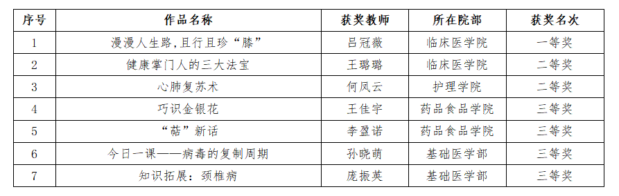 由教育部高校教师网络培训中心吉林职教基地、吉林省高等院校应用型教育微课教学比赛组委会举办的2021吉林省高等院校应用型教育微课教学比赛,全省33所院校、830件参赛作品进行了网上评审。我校共有55件作品参加校级遴选,其中吕冠薇等22位教师的作品推荐参加省级评审。并获得个人作品奖一等奖1项、二等奖2项、三等奖4项;护理基础技术团队获微课优秀团队奖三等奖。