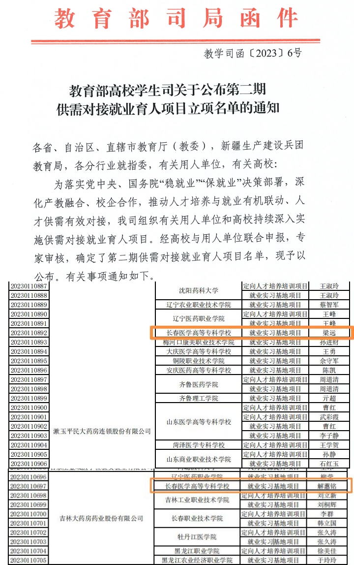 近日,教育部公布第二期供需对接就业育人项目立项名单。长春医学高等专科学校与吉林大药房药业股份有限公司、漱玉平民大药房连锁股份有限公司2个供需对接就业育人项目顺利通过审批,获准立项,全部为就业实习基地项目。