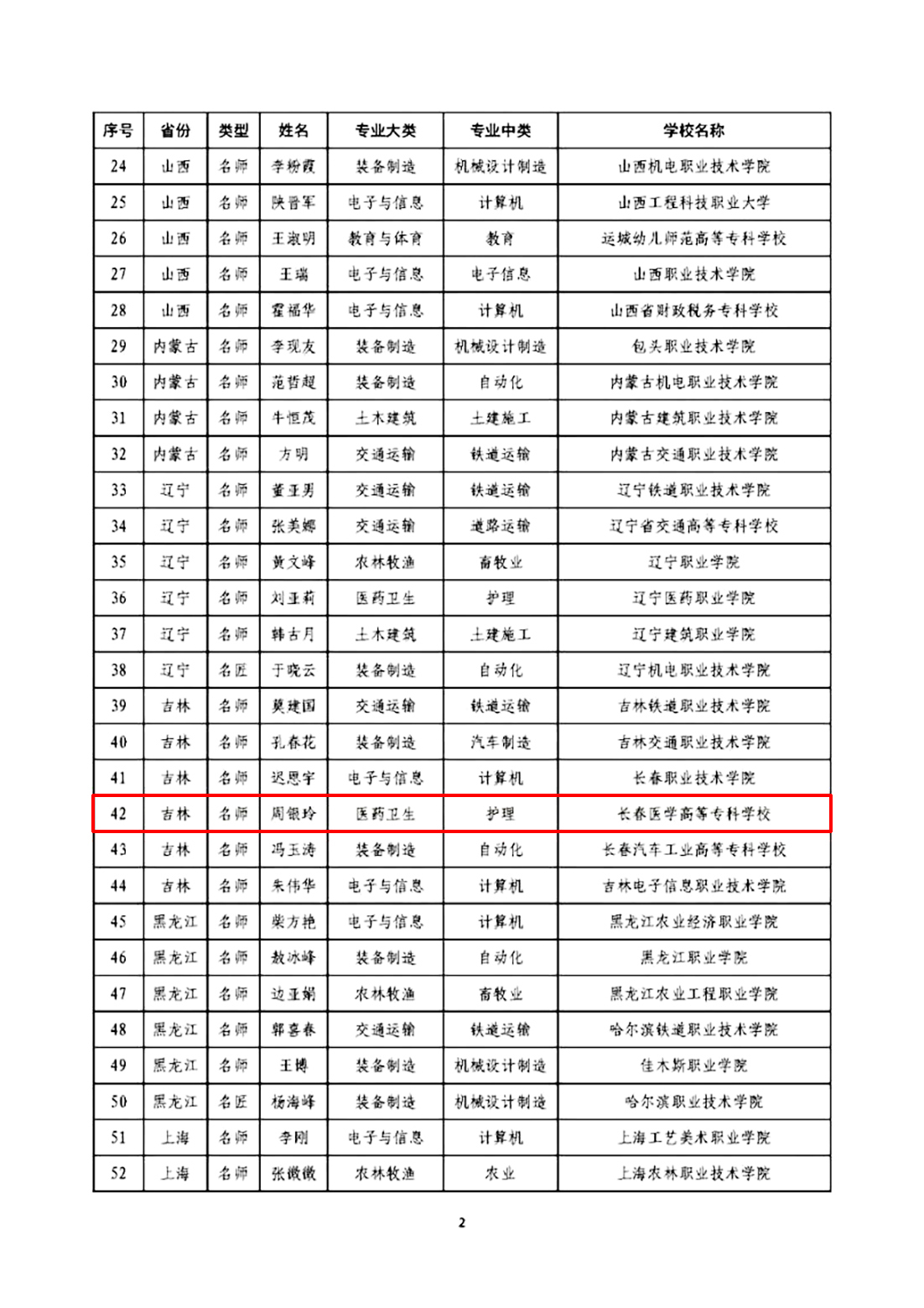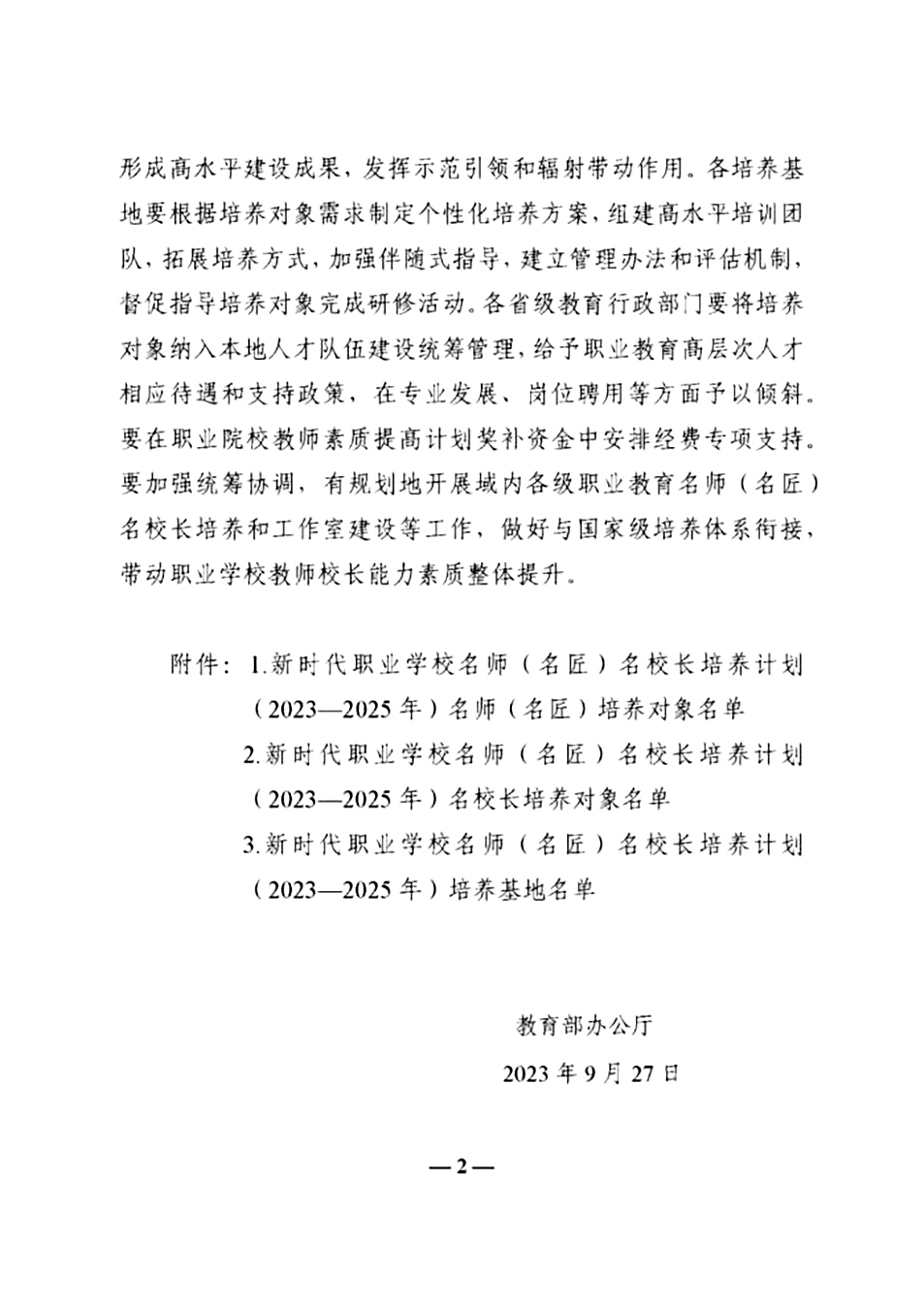 为深入学习贯彻党的二十大精神,落实中共中央办公厅、国务院办公厅《关于深化现代职业教育体系建设改革的意见》要求,不断加强职业学校教师校长队伍建设,教育部于2023年7月启动“新时代职业学校名师(名匠)名校长培养计划”(以下简称职教“三名”计划)评选工作。经省级教育行政部门推荐,专家综合评议,最终确定高职院校名师(名匠)培养对象210人并于近日公布。我校三级教授、总督学周银玲同志赫然在列!