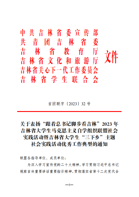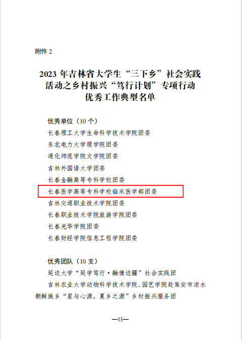近日,中共吉林省委宣传部、共青团吉林省委、吉林省教育厅、吉林省文化和旅游厅、吉林省关心下一代工作委员会和吉林省学生联合会发布《关于表扬“跟着总书记脚步看吉林”2023 年吉林省大学生马克思主义自学组织联盟社会实践活动暨吉林省大学生“三下乡”主题社会实践活动优秀工作典型的通知》,我校临床医学部团委荣获乡村振兴“笃行计划”专项行动优秀单位、医学技术学院“医之行”实践团获评社会实践活动优秀团队、团委书记刘思雅获评社会实践优秀个人。