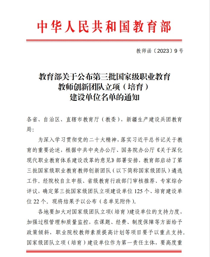 据悉,2019年,教育部启动实施了全国职业院校教师教学创新团队建设项目,三年为一个建设周期,面向全国中、高等职业学校和应用型本科高校,聚焦战略重点产业领域和民生紧缺领域专业,分年度、分专业建设各级各类创新团队。