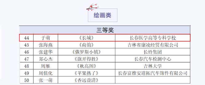 在长春市首届职工文化艺术节系列活动——长春市职工书画摄影优秀作品展中,我校教师于萌同志获得绘画类作品三等奖。
