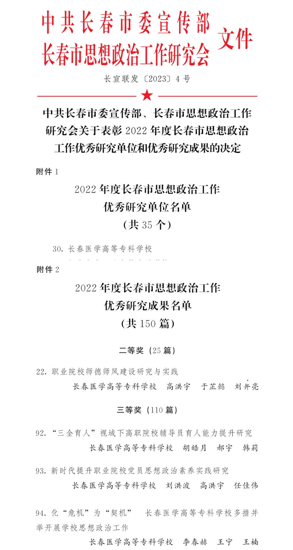 由高洪宇、于芷懿、刘井亮撰写的《职业院校师德师风建设研究与实践》荣获2022年度长春市思想政治工作优秀研究成果二等奖;由胡皓月、郝宇、韩莉撰写的《“三全育人”视域下高职院校辅导员育人能力提升研究 》,刘洪波、高洪宇、任佳伟撰写的《新时代提升职业院校党员思想政治素养实践研究》,李春赫、王宁、王楠撰写的《化 “危机”为 “契机” 长春医学高等专科学校多措并举开展学校思想政治工作》荣获2022年度长春市思想政治工作优秀研究成果三等奖。学校获得2022年度长春市思想政治工作优秀研究单位荣誉称号。