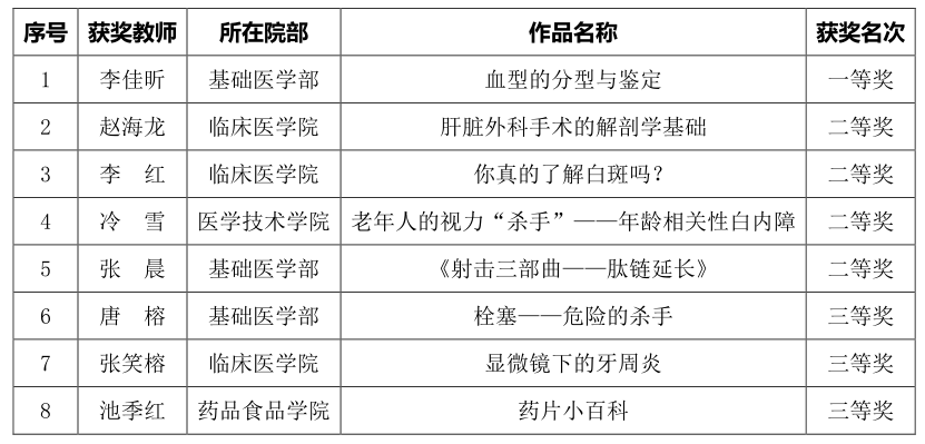 近日,由全国高校教师网络培训中心吉林职教基地、吉林省高等院校应用型教育微课教学比赛组委会举办的2023吉林省高等院校应用型教育微课教学比赛公布评选结果。全省共计31所院校906件参赛作品参与评选,我校共有21件作品参加遴选,其中李佳昕获个人作品奖一等奖,赵海龙等4位老师获个人作品二等奖,唐榕等3位老师获个人作品三等奖;口腔组织病理学等2个团队分别获得优秀团队奖二、三等奖;王月珍获评优秀评审专家。