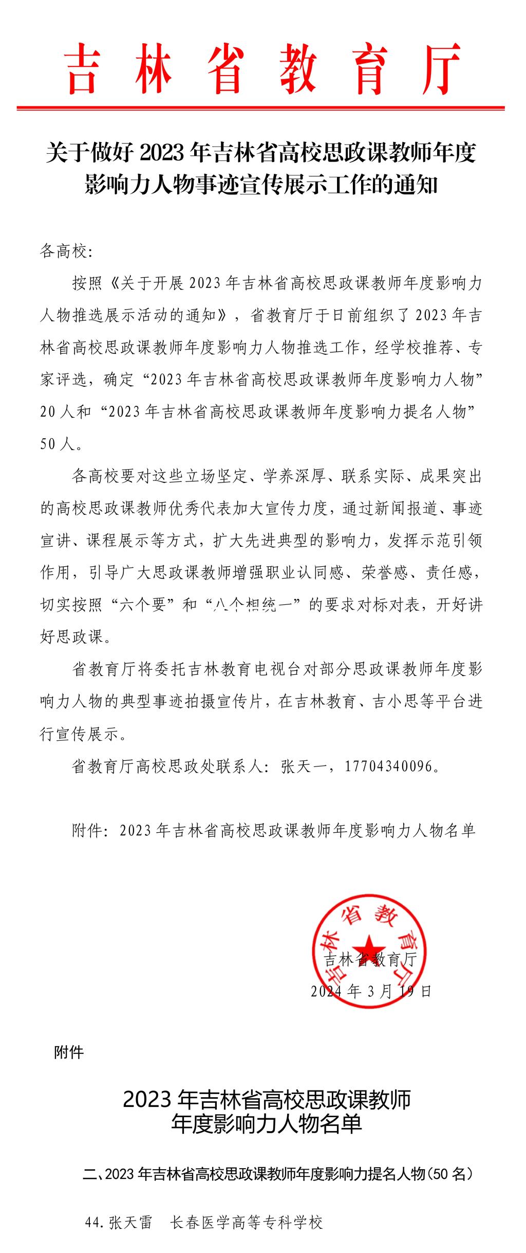 为深入贯彻落实习近平总书记在全国思政课教师座谈会上的重要讲话精神,着力打造高素质的高校思想政治工作队伍,根据《关于开展2023年吉林省高校思政课教师年度影响力人物推选展示活动的通知》,经学校党委推荐、省委教育工委专家评审和公示等环节,我校思政部教师张天雷获“2023年吉林省高校思政课教师年度影响力人物提名”。