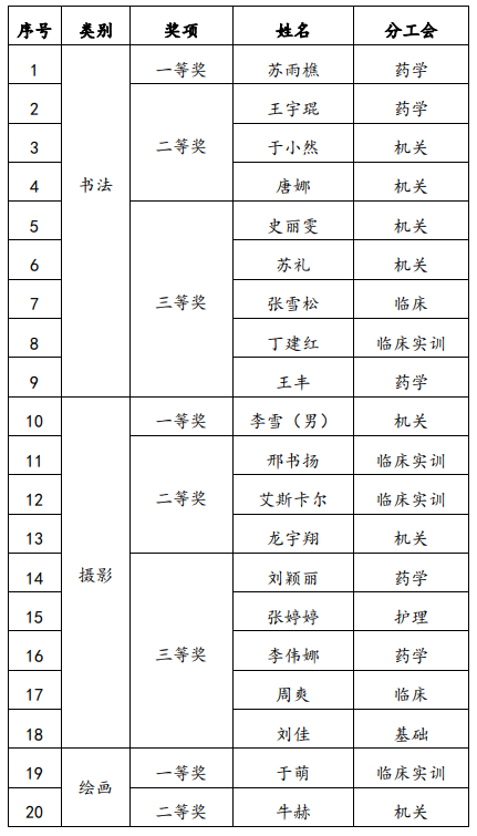 此次活动共征集到不同类型的优秀作品百余幅,结合本次活动主题,工会组织评委分别评选出书法、绘画、摄影一、二、三等奖及最佳组织奖。苏雨樵、于萌、李雪(男)分别获书法、绘画、摄影一等奖,机关分工会获最佳组织奖,另有50名工会会员获参与奖。这些作品主题鲜明、题材广泛、立意新颖、风格多样、内涵丰富,充分表达了广大教职工热爱党、热爱祖国的真挚情怀,生动展示了医专人昂扬向上的精神风貌、干事创业的工作热情以及对美好生活的向往。