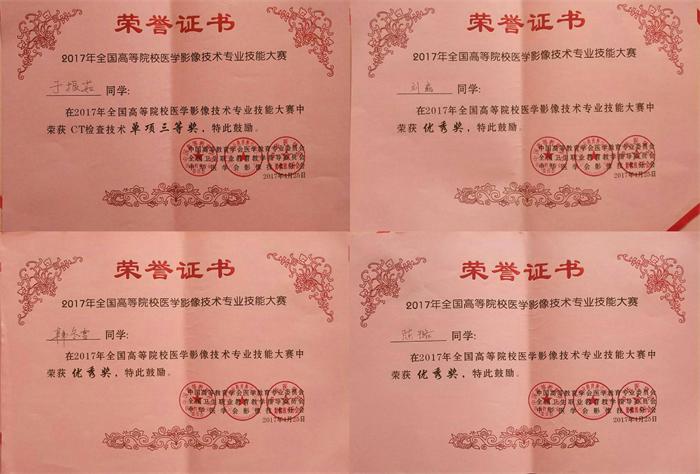 4月23至26日,影像专业5人参赛队代表我校参加了由中国高等教育学会医学教育专业委员会和全国卫生职业教育教学指导委员会主办,中华医学会影像技术分会协办,上海健康医学院承办的,2017年全国高等院校医学影像技术专业技能大赛,4名选手均获得奖项,其中CT技术三等奖1项,优秀奖3项。