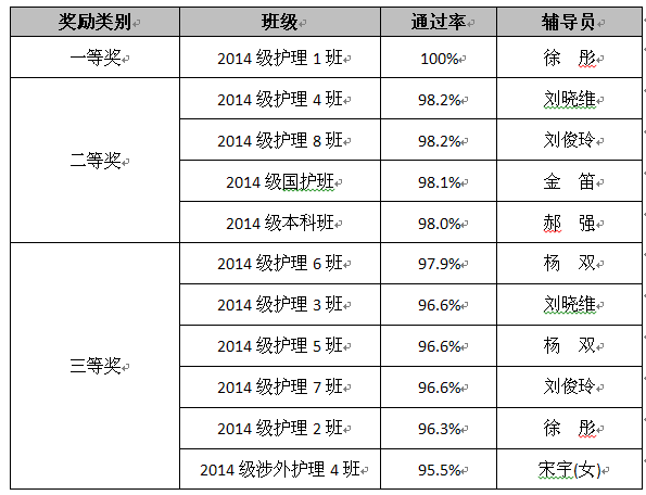 执业护士资格证考试成绩是检验护理专业人才培养水平的重要标准,是决定护理专业毕业生就业能力和素质的首要因素。在2017年护士执业资格考试中,在试题难度明显高于往年的情况下,护理学院2014级各班通过率达到95.67%,远远超过全国平均水平,是我校护士执业考试的历史最高成绩,为学校赢得了荣誉,为强化我校护理专业人才培养以及执业护士考试培训工作树立了信心。为进一步提升学生管理工作内涵,激励各班辅导员的内在工作动力,经学校研究决定,对护考成绩突出的班级辅导员给予全校通报表扬并颁发奖励金。标准如下: