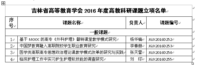 根据《关于申报吉林省高等教育学会2016年度高教科研课题的通知》(吉高学会[2016]6号)文件要求,6月中下旬,经过个人申报、系部推荐和学校专家评审等环节,我校共申报了6个课题参评吉林省高等教育学会2016年度高教科研课题,经吉林省高等教育学会组织专家认真评审,我校共有4个课题获得立项(名单附后)。