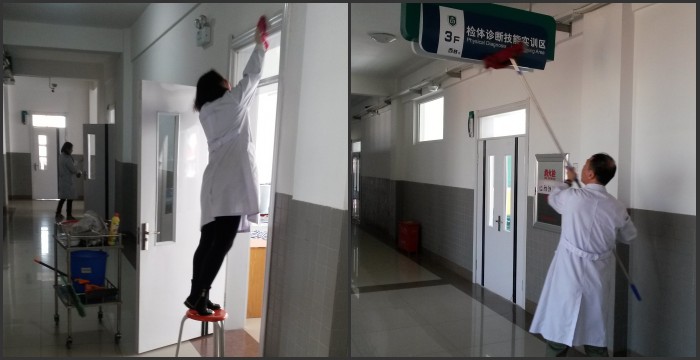 模拟医院很多实验员老师周六周日也没有休息,对实训室的天棚蜘蛛网、照明灯上灰尘以及窗户、窗台等全面认真清扫,两办人员对走廊公共区域的文化宣传板、条幅、楼层实训区域指示牌、门牌、消防设施、报警贴、指示灯、厕所等进行了彻底清查和清理。王春梅主任亲自对模拟医院四个楼层进行全面检查,对发现的问题及时通报并限期半天进行整改。