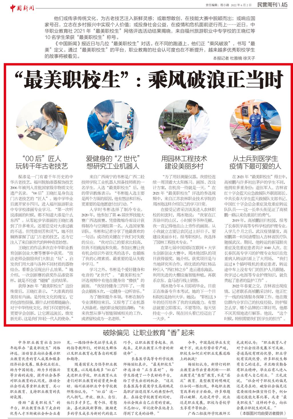 《中国新闻》报近日与几位“最美职校生”对话。在不同的跑道上,他们正“乘风破浪”,书写“最美”定义。通过“最美职校生”的平台,职业教育的社会认可度也在不断提升,越来越多优秀职校学生的故事将被看见。