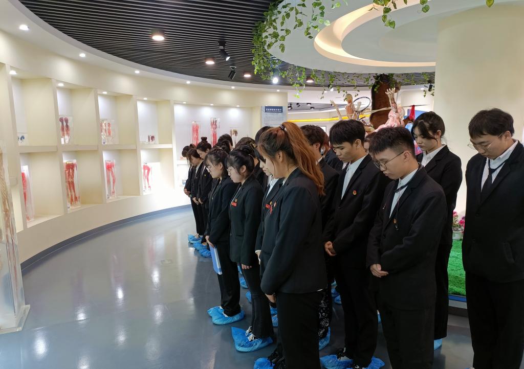 同学们在生命科学馆参观了“生命的诞生展区”、“人体塑化及管道铸型标本展区”、“病理标本展区”等9个特色展区,讲解员们用生动的语言为同学们进行了详细的讲解,使同学们深刻体会到了生命的奥秘和珍贵。在人体系统标本展区,讲解员以吸烟者肺的塑化标本为同学们讲解了吸烟使肺变黑的过程,同时以不吸烟者的肺作为对比,劝诫同学们不要吸烟。参观过程中,光华学院的同学们进行了默哀仪式,感恩为医学做出贡献的大体老师们。