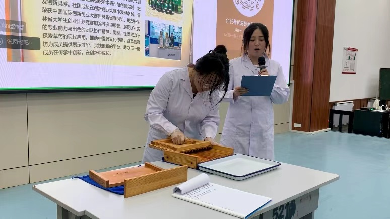 分享会伊始,2025年世界职业院校技能大赛总决赛高职组医药生产与经营赛道(中药传统技能赛项)金奖团队代表刘津畅同学以“以技笃行 逐光成长”为主题,率先分享备赛心路。她生动还原了团队备赛的全流程:备赛初期,团队系统开展知识体系梳理,反复打磨中药传统技能操作细节;进入赛前冲刺阶段,面对高强度的训练任务,团队不仅强化技能熟练度,更注重成员间的心态调节与协作配合。分享过程中,团队成员毕欣茹、王宇娇现场展示传统手工中药水蜜丸制作技艺,称重和药、制丸、搓圆等一系列操作行云流水,精准规范,既展现了中医药文化的千年底蕴,也彰显了职业技能的严谨魅力,让在场学子直观感受到专业技能的实践价值。