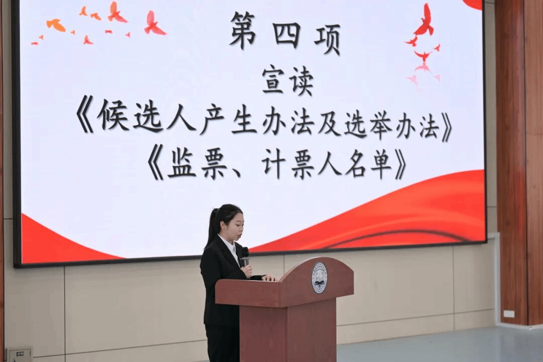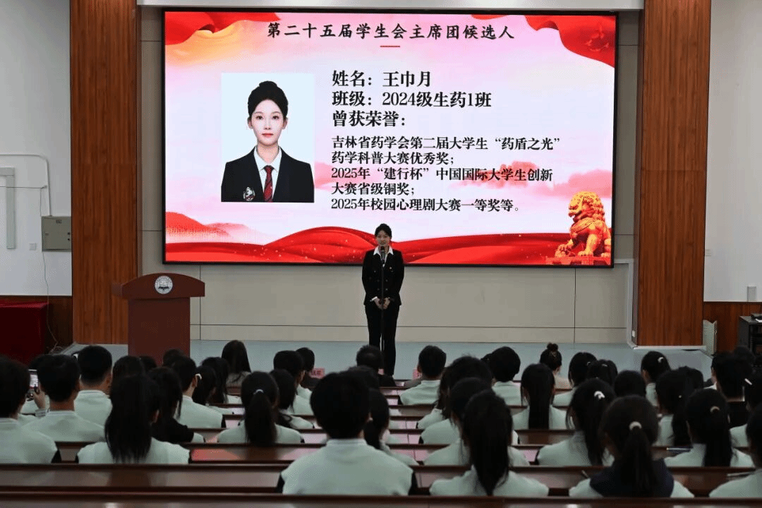 大会审议通过《候选人产生办法及选举办法》及《监票、计票人名单》。三名候选人王巾月、刘津畅、赵洺瑶依次发表竞选演讲,围绕工作规划与服务理念展开阐述。经无记名投票,王巾月、刘津畅当选为药品食品学院第二十五届学生会主席团成员。全场以热烈掌声表达对新一届主席团的认可与期待。